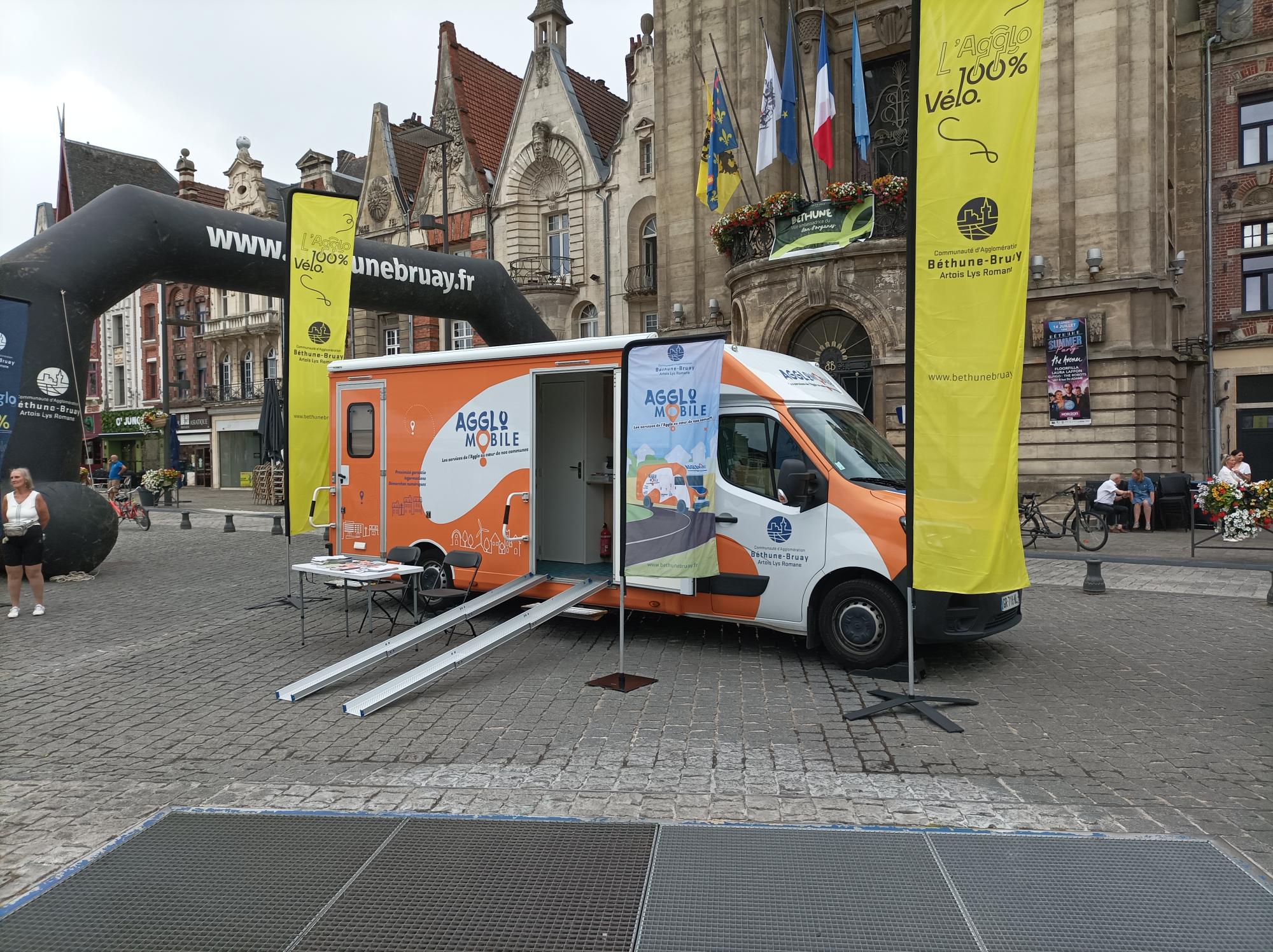 Mercredi 4 mars, 9h. L’Agglo Mobile, un camping-car aménagé en bureau itinérant, s’est garée sur le parking de la mairie de Noyelles-lès-Vermelles, à 10 km au sud-est de Béthune. Julie et Pascal, deux agents de la CABBALR, y sont prêts à accueillir tous les usagers qui ont des questions en lien avec les services de l’agglomération ou qui ont besoin d’être accompagnés dans leurs démarches auprès de la collectivité. Ils y resteront jusqu’à midi. L’engin rejoindra alors un autre site pour l’après-midi. À raison de deux communes par jour, il couvre ainsi tout le territoire en deux mois, faisant faire des économies de temps aux habitants.